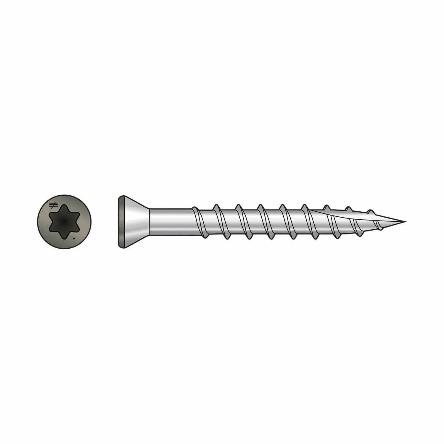 The Simpson T07162FT70GR Trim-Head Screw is a corrosion-resistant fastener designed for demanding environments, featuring a trim head with a 6-lobe star drive for secure grip and easy installation.